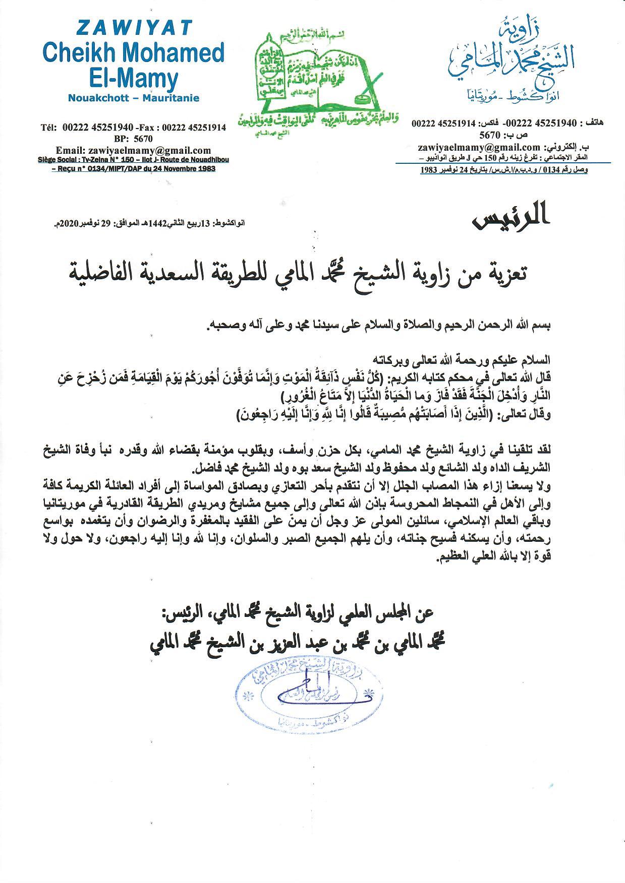 لقد تلقينا في زاوية الشيخ محمد المامي، بكل حزن وأسف، وبقلوب مؤمنة بقضاء الله وقدره نبأ وفاة الشيخ الشريف الداه ولد الشائع ولد محفوظ ولد الشيخ سعد بوه ولد الشيخ محمد فاضل.